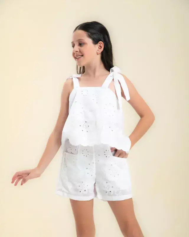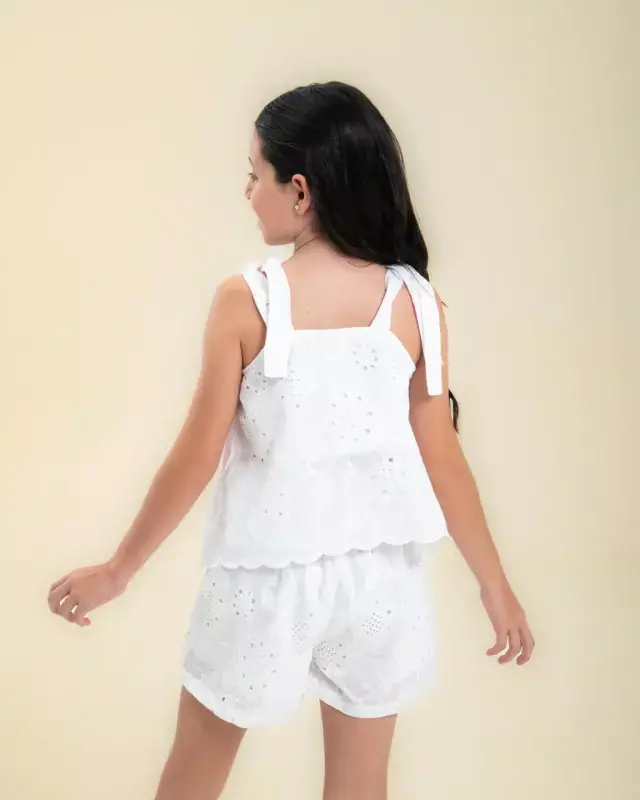 Descubra o conjuntinho super estiloso que une delicadeza e praticidade em uma única peça. Composto por um short e uma blusa, ambos todo bordados em laise 100% algodão, este conjunto é perfeito para quem busca sofisticação aliada ao conforto.